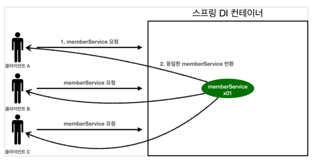 - 스프링 컨테이너를 통해서 고객의 요청이 올 때마다 만들어진 객체를 공유해서 효율적으로 쓸 수 있다.