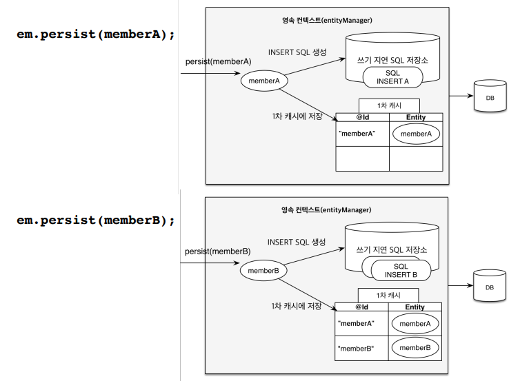 - insert sql을 생성해서 쓰기 지연 sql 저장소에 저장한다. 쓰기 지연 SQL 저장소에는 2개의 insert문이 저장되어 있다.