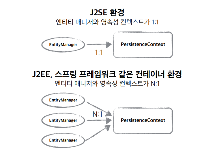 - 엔티티 매니저를 생성하면 눈에 보이지 않는 영속성 컨텍스트에 담긴다.