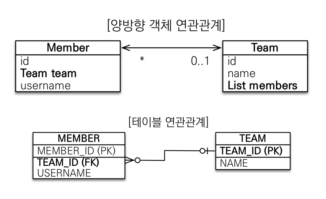 - 객체의 양방향 관계는 사실 양방향 관계가 아니라 서로 다른 단방향 관계 2개다.