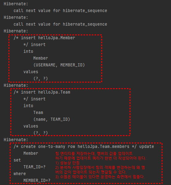 - 연관관계 관리를 위해 추가로 UPDATE SQL 실행