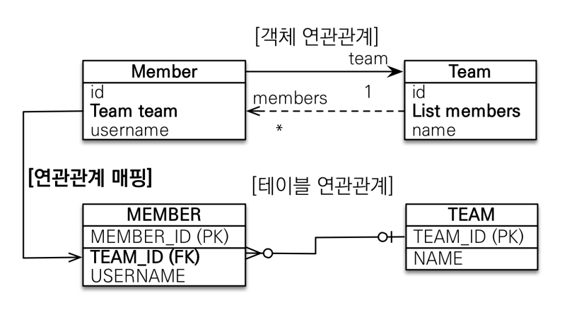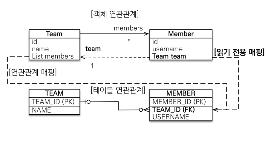 - 객체와 테이블의 차이 때문에 반대편 테이블의 외래 키를 관리하는 특이한 구조