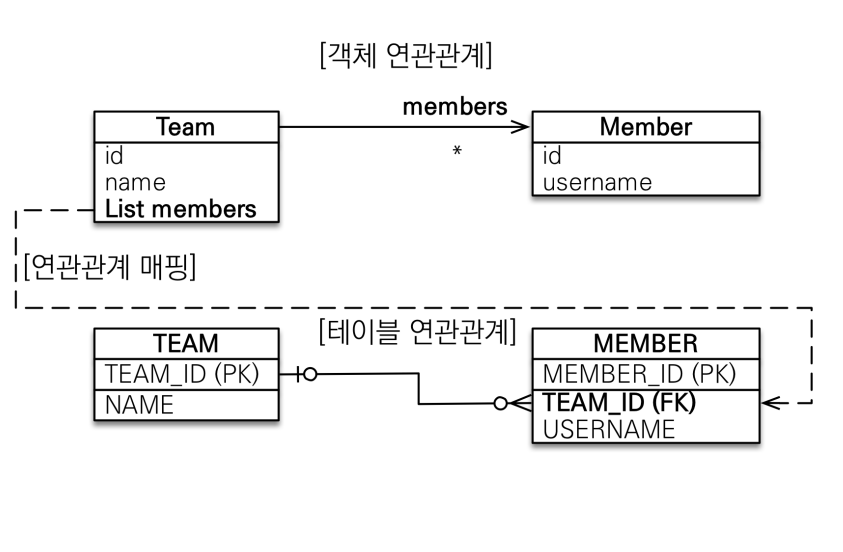 - DB입장을 생각해보자. 팀이랑 멤버인데, 무조건 N 쪽에 외래 키를 들어갈 수밖에 없다.