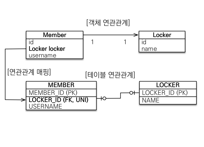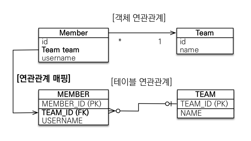 - 테이블은 외래 키 하나로 두 테이블이 연관관계를 맺음