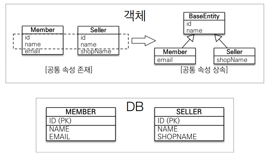 - 참고: @Entity 클래스는 엔티티나 @MappedSuperclass로 지정한 클래스만 상속 가능